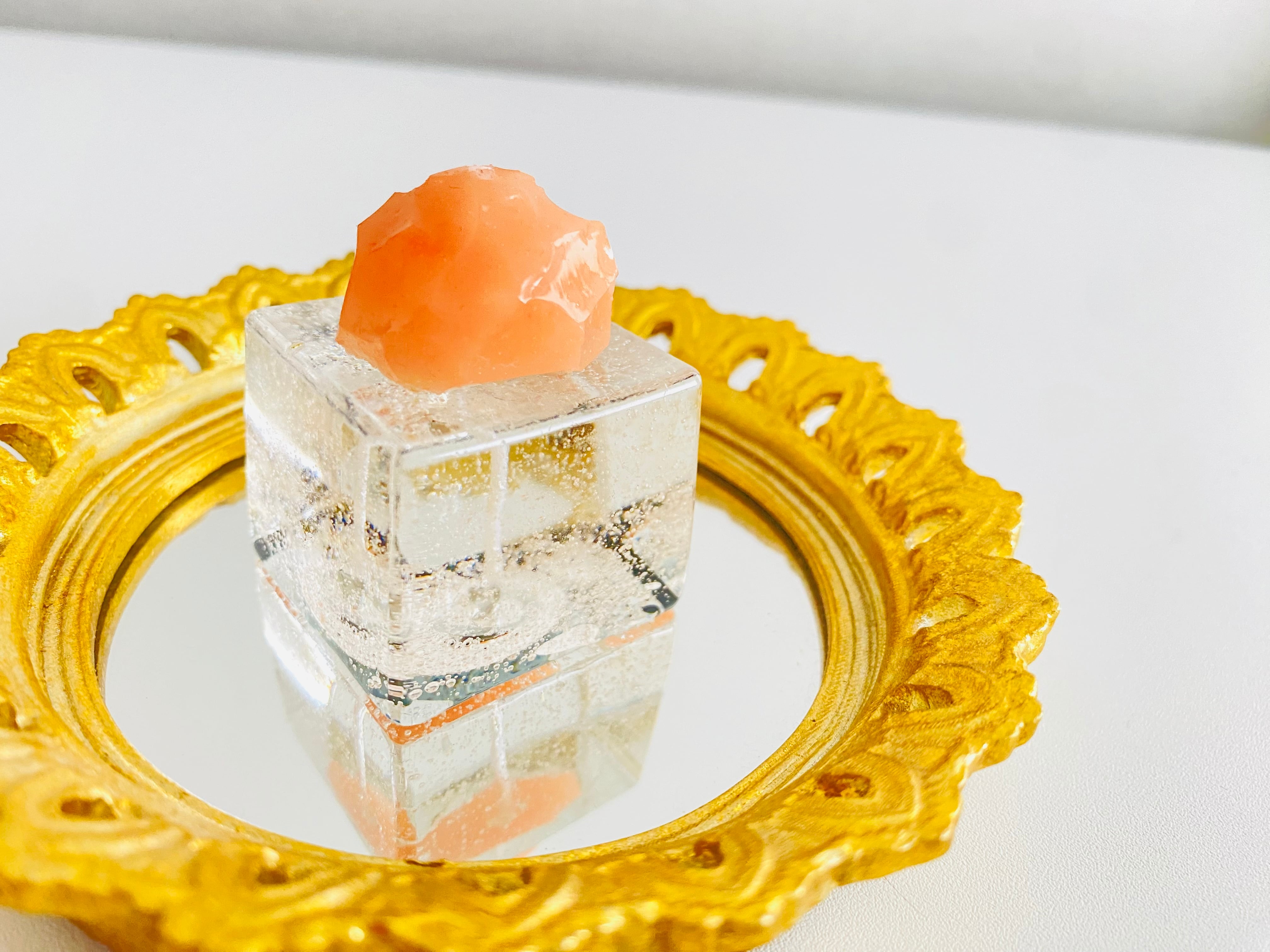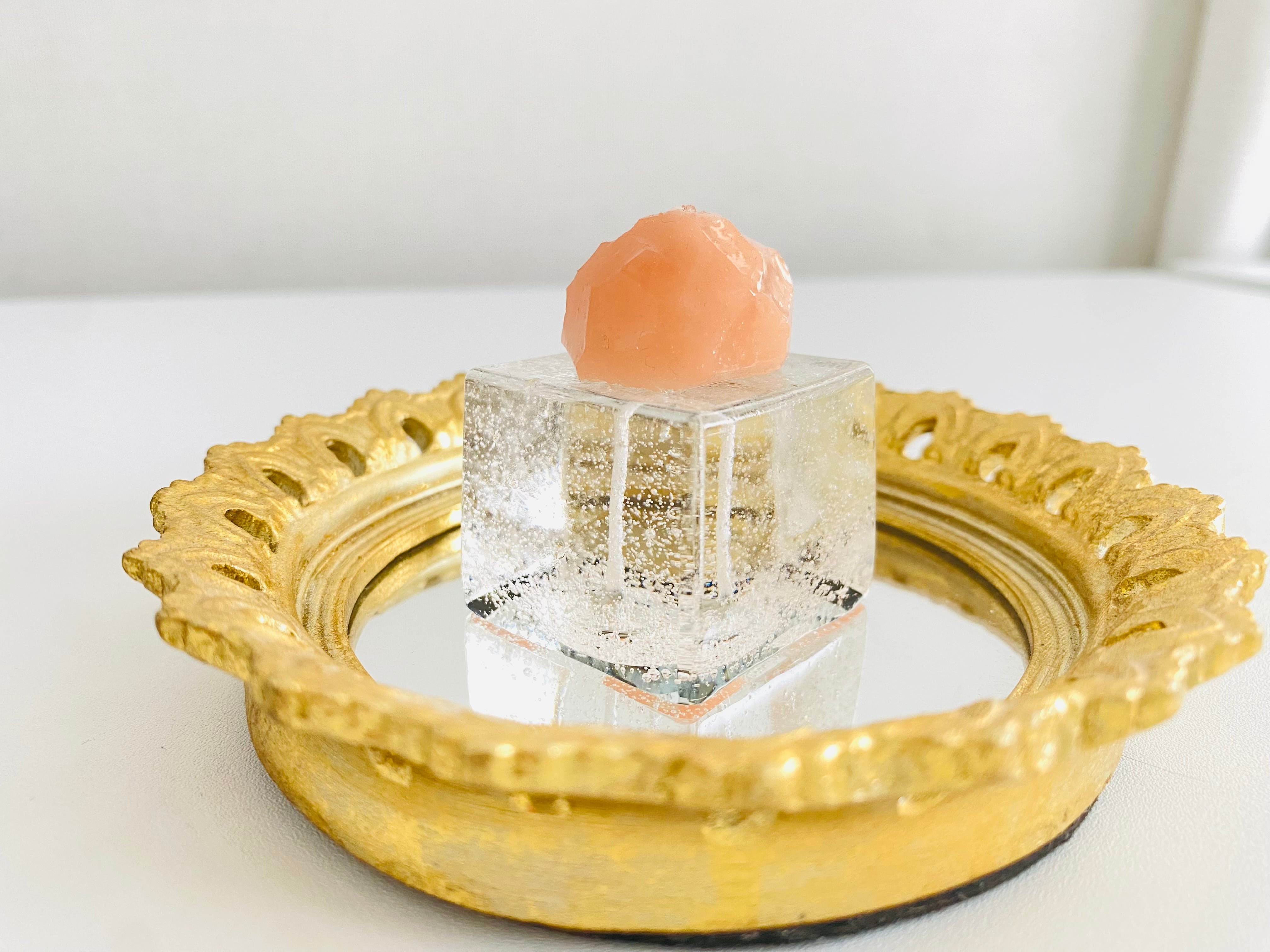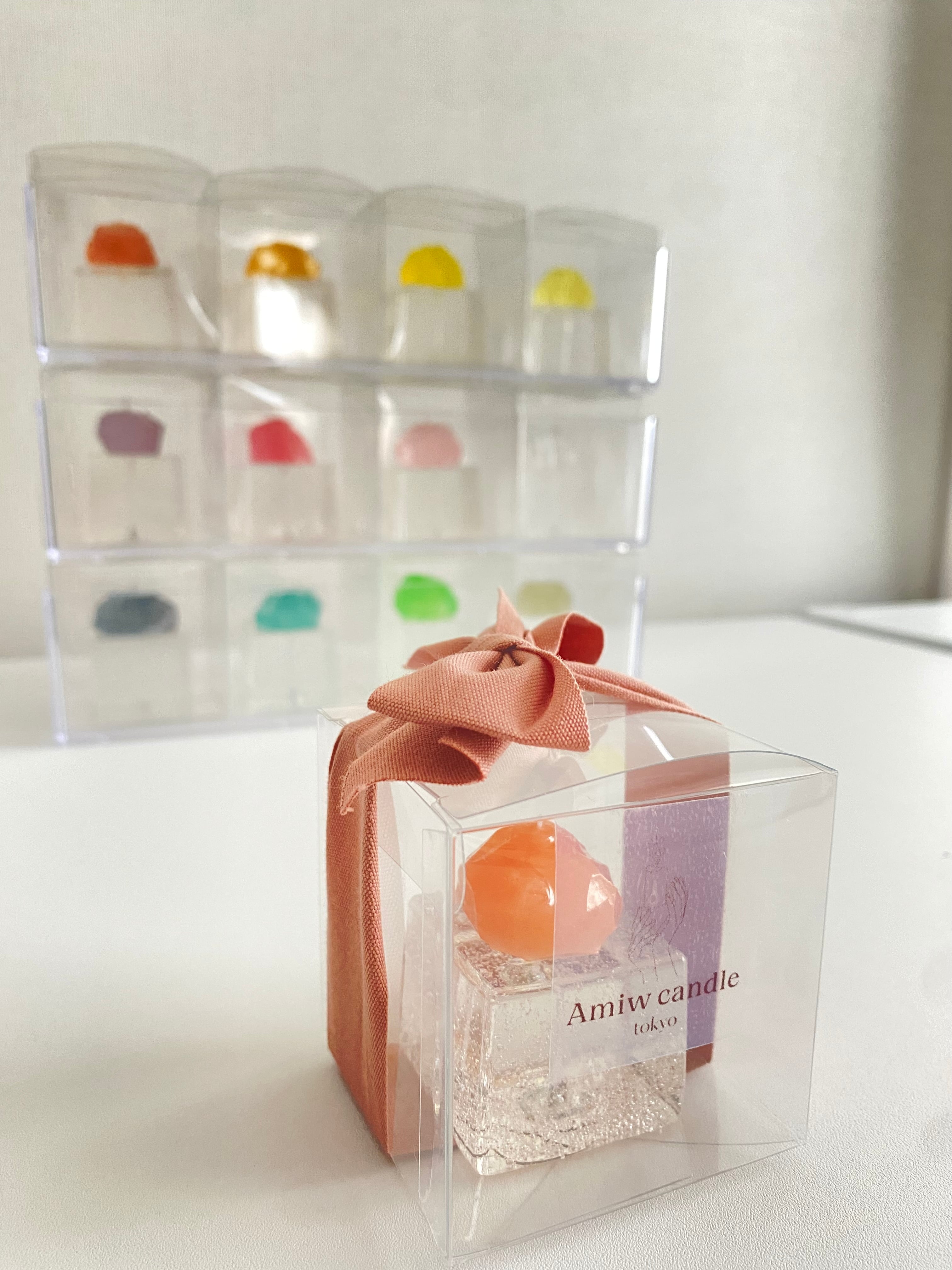 スクエアのクリアキャンドルの上にカラーストーンのようなキャンドルを乗せて