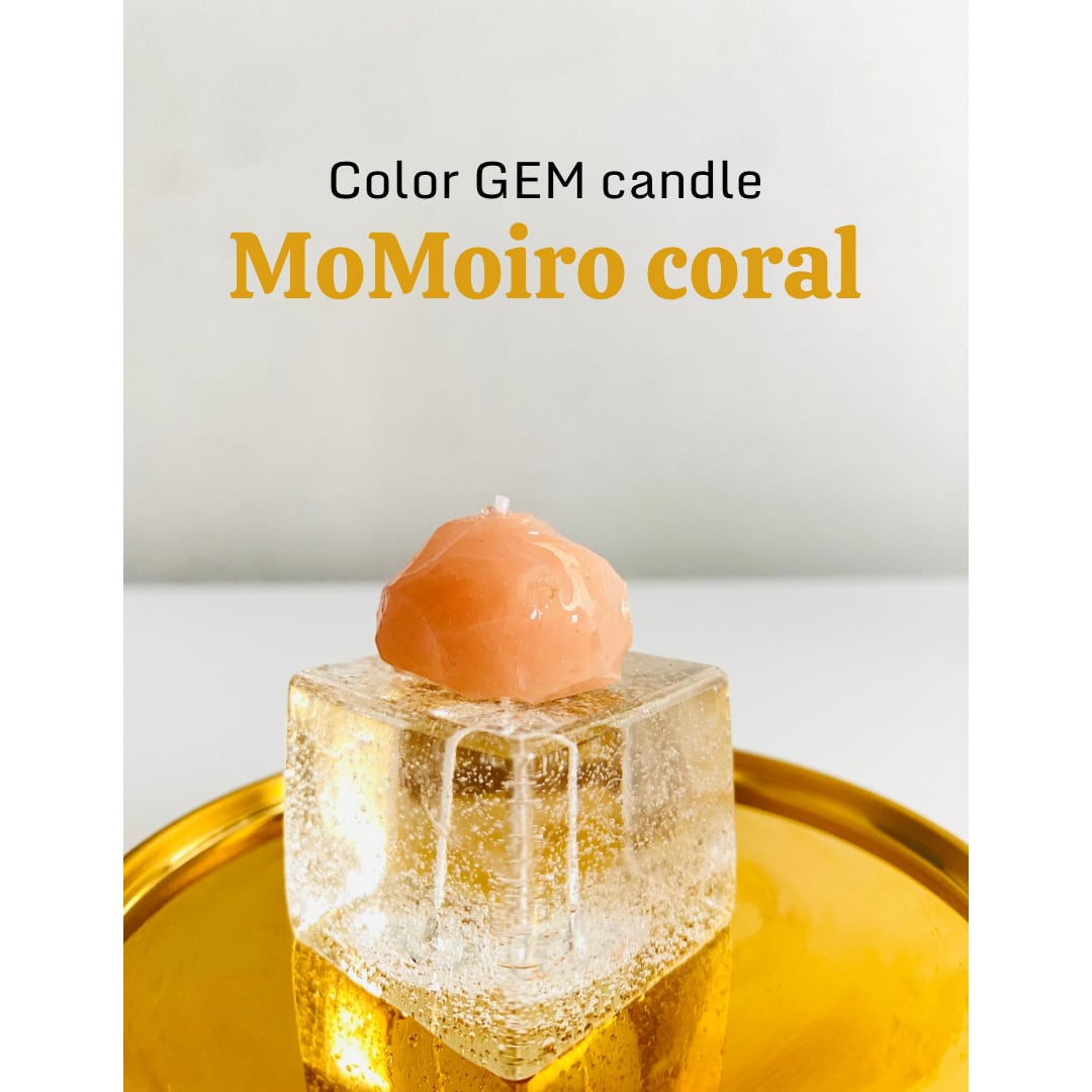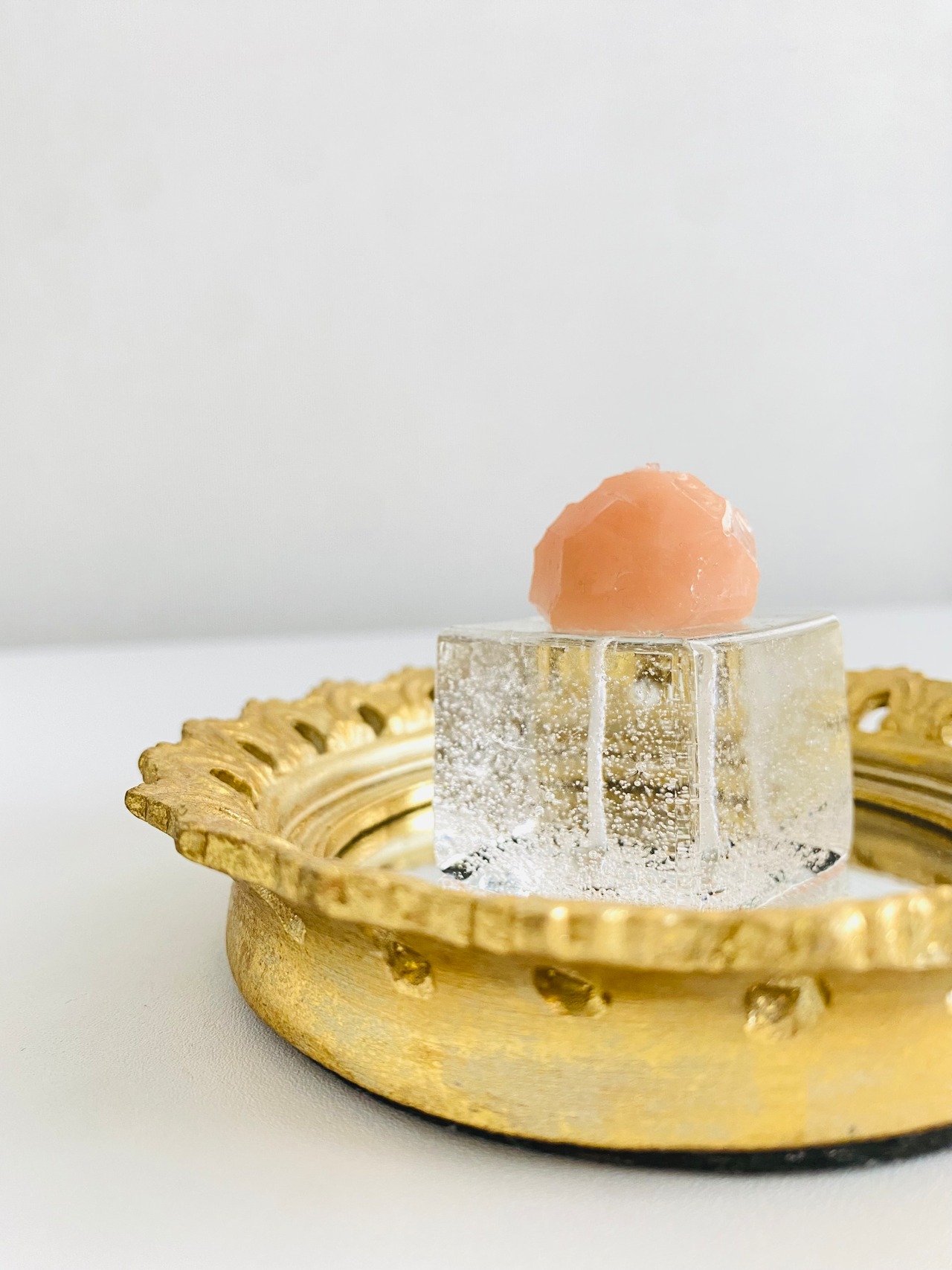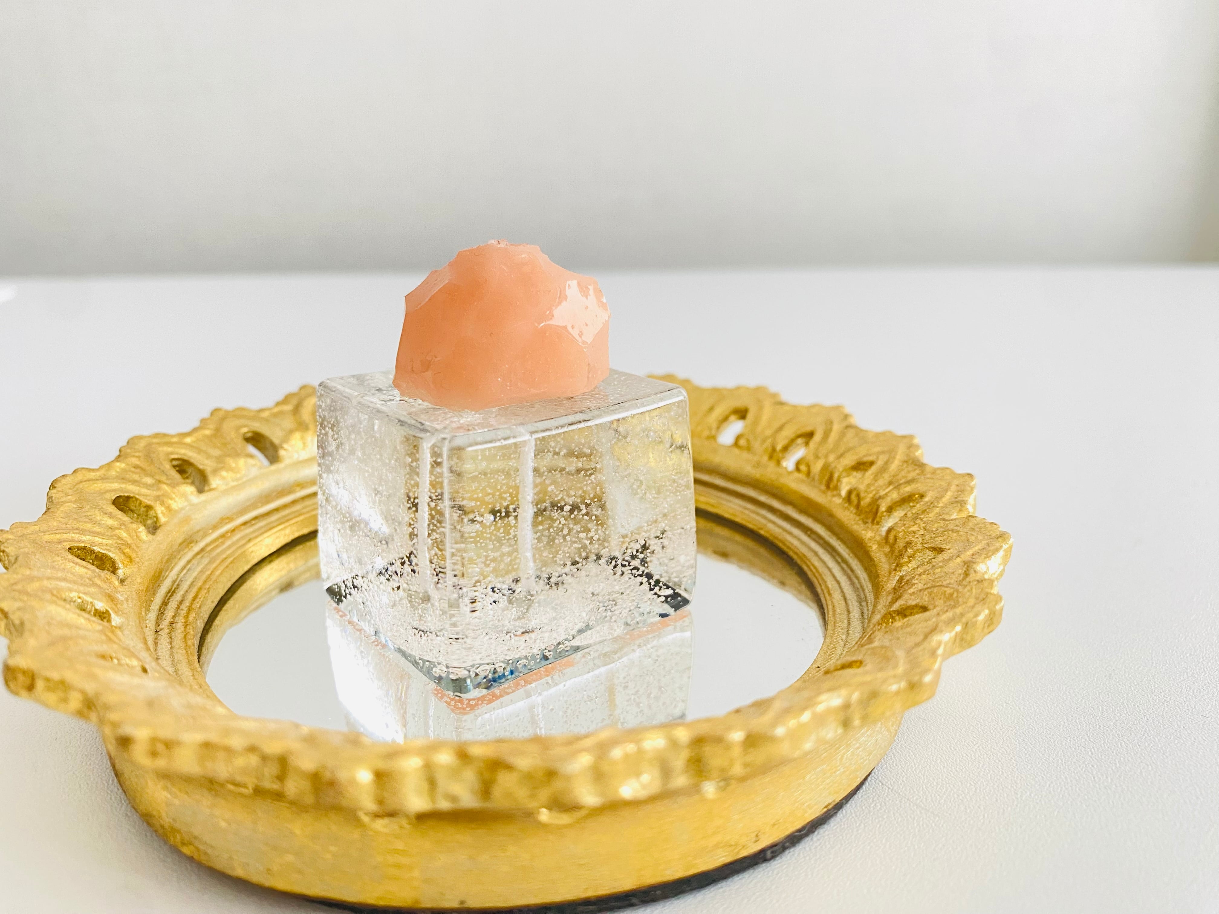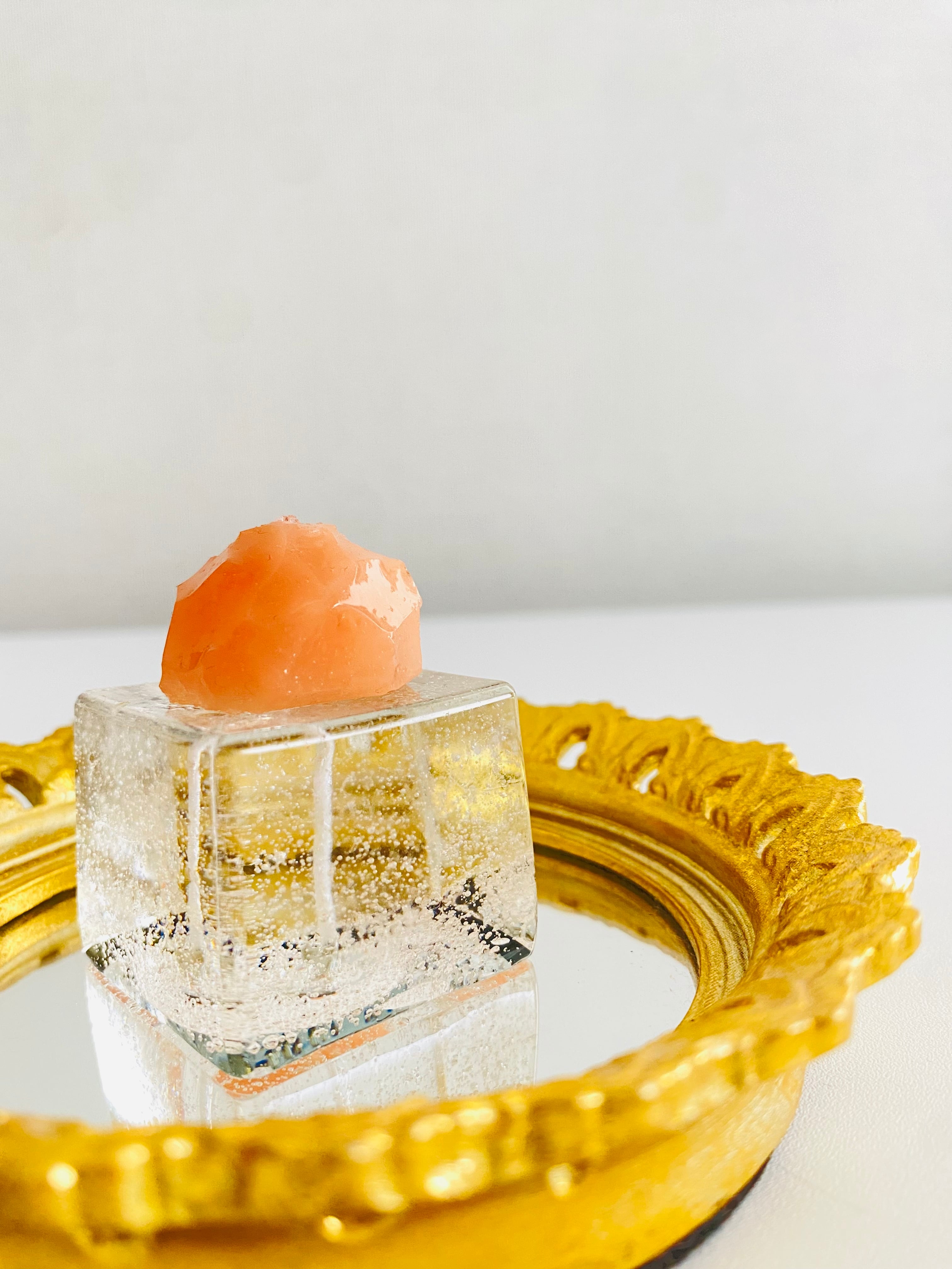 スクエアのクリアキャンドルの上にカラーストーンのようなキャンドルを乗せて