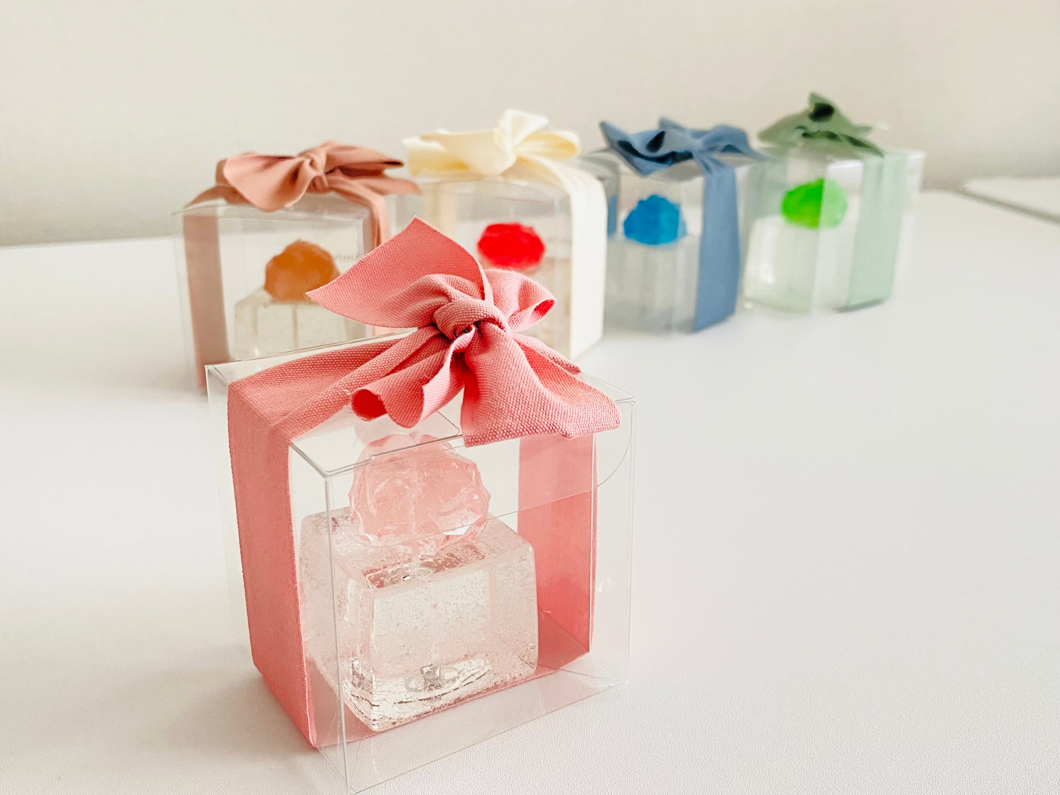 スクエア型のクリアボックスに入れて、リボンを付けてお届けいたします。