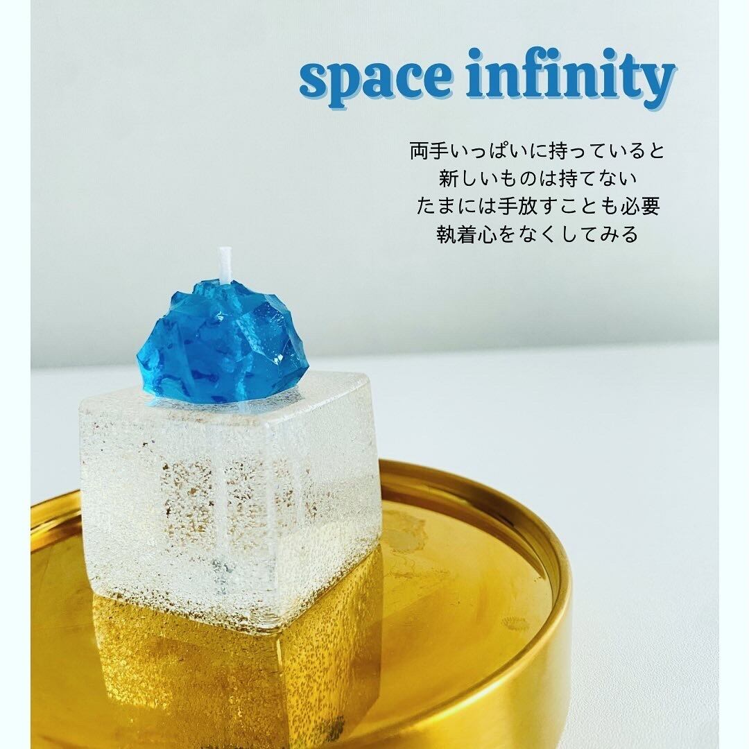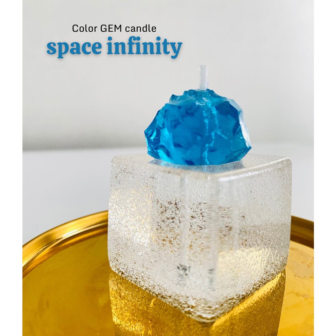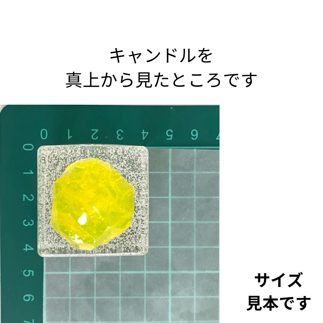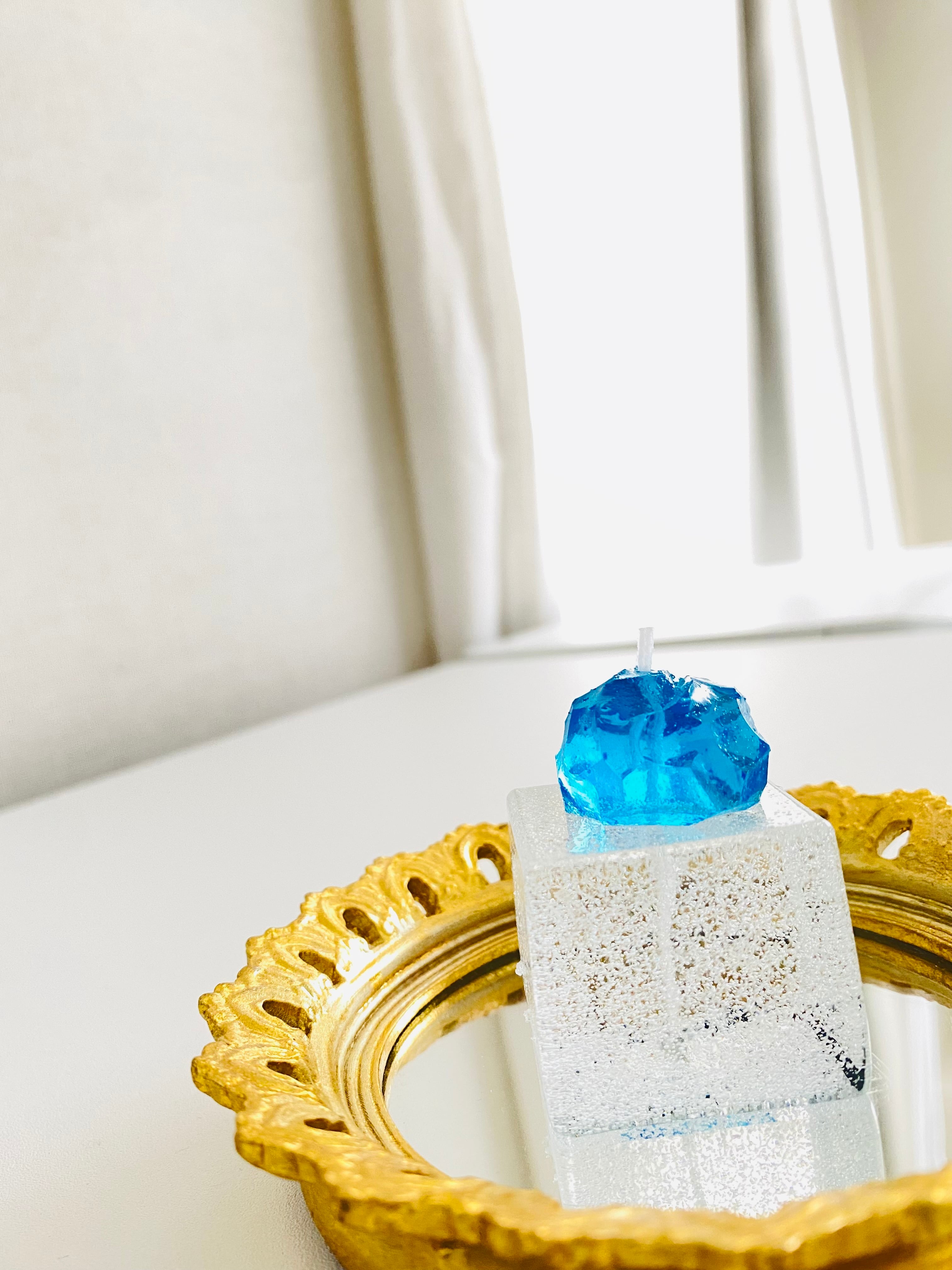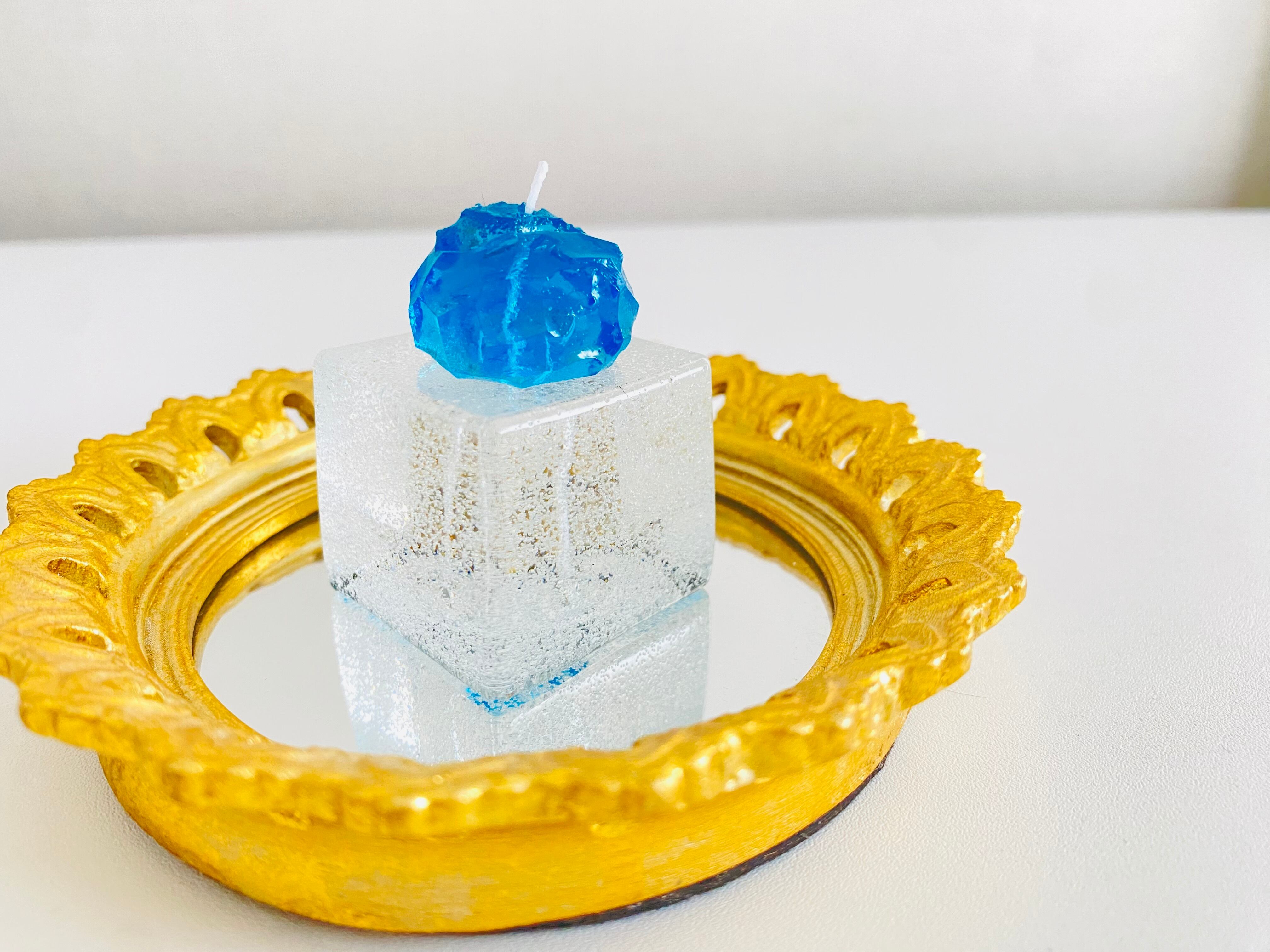 スクエアのクリアキャンドルの上にカラーストーンのようなキャンドルを乗せて