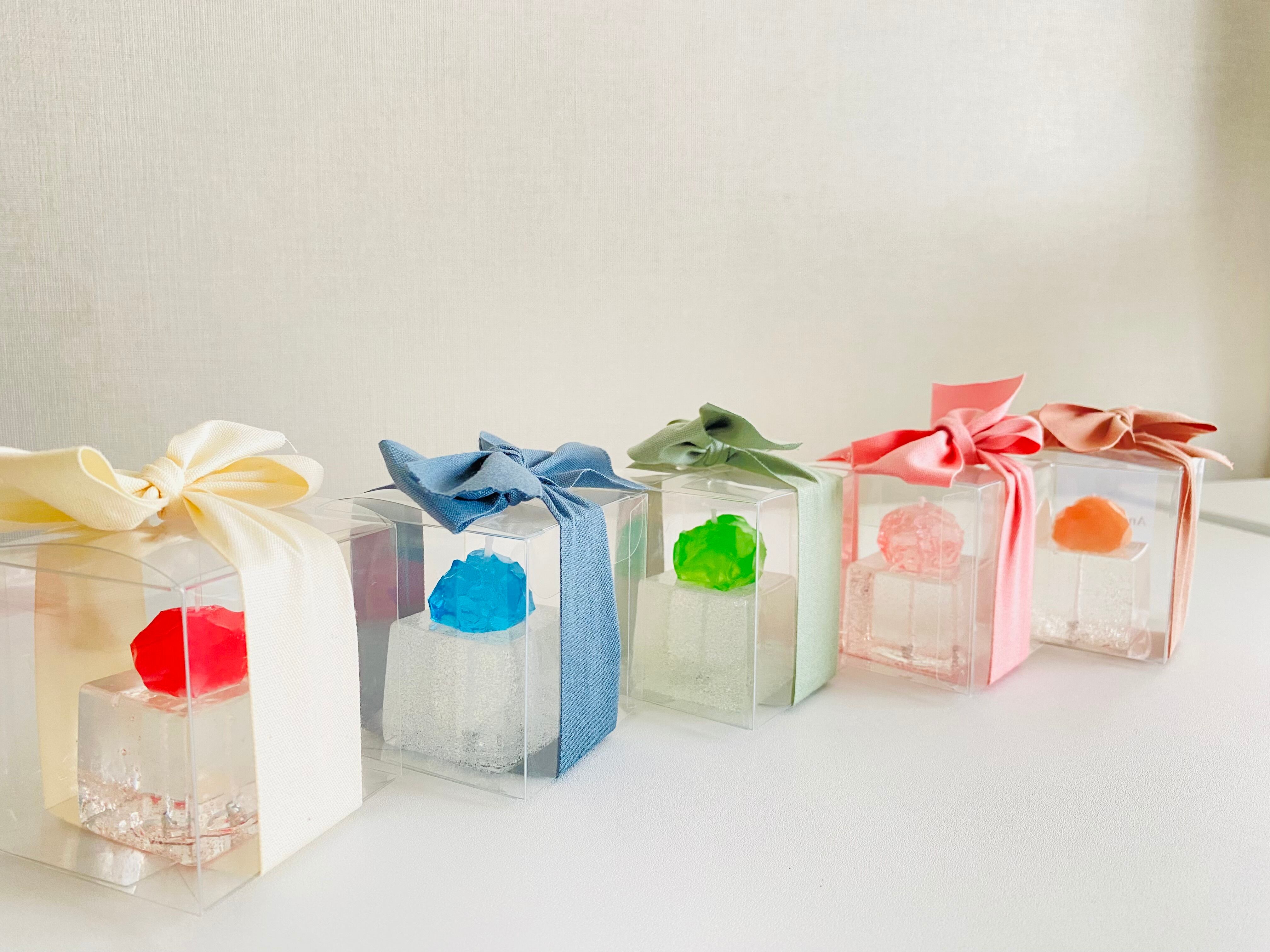 スクエア型のクリアボックスに入れて、リボンを付けてお届けいたします。