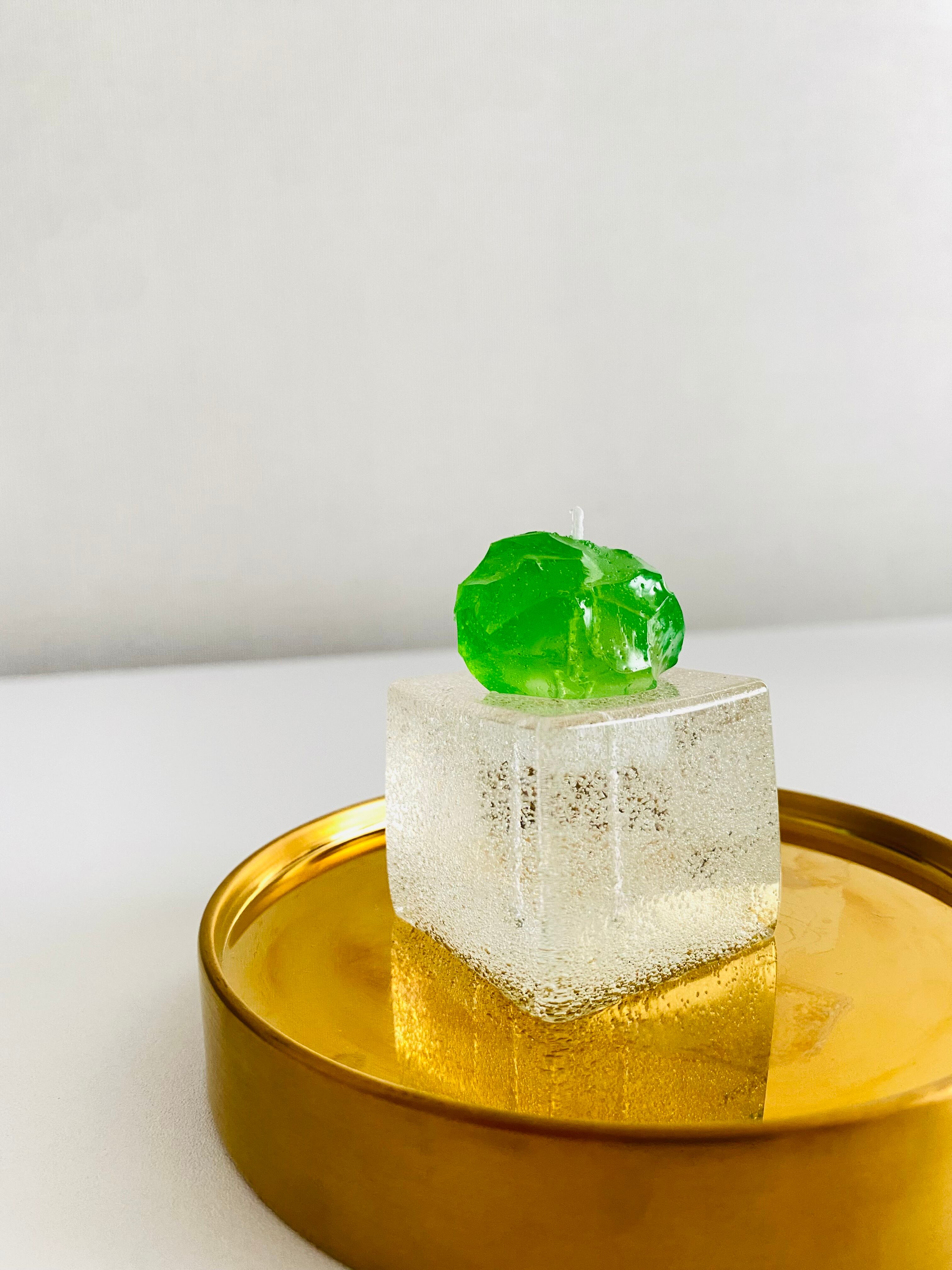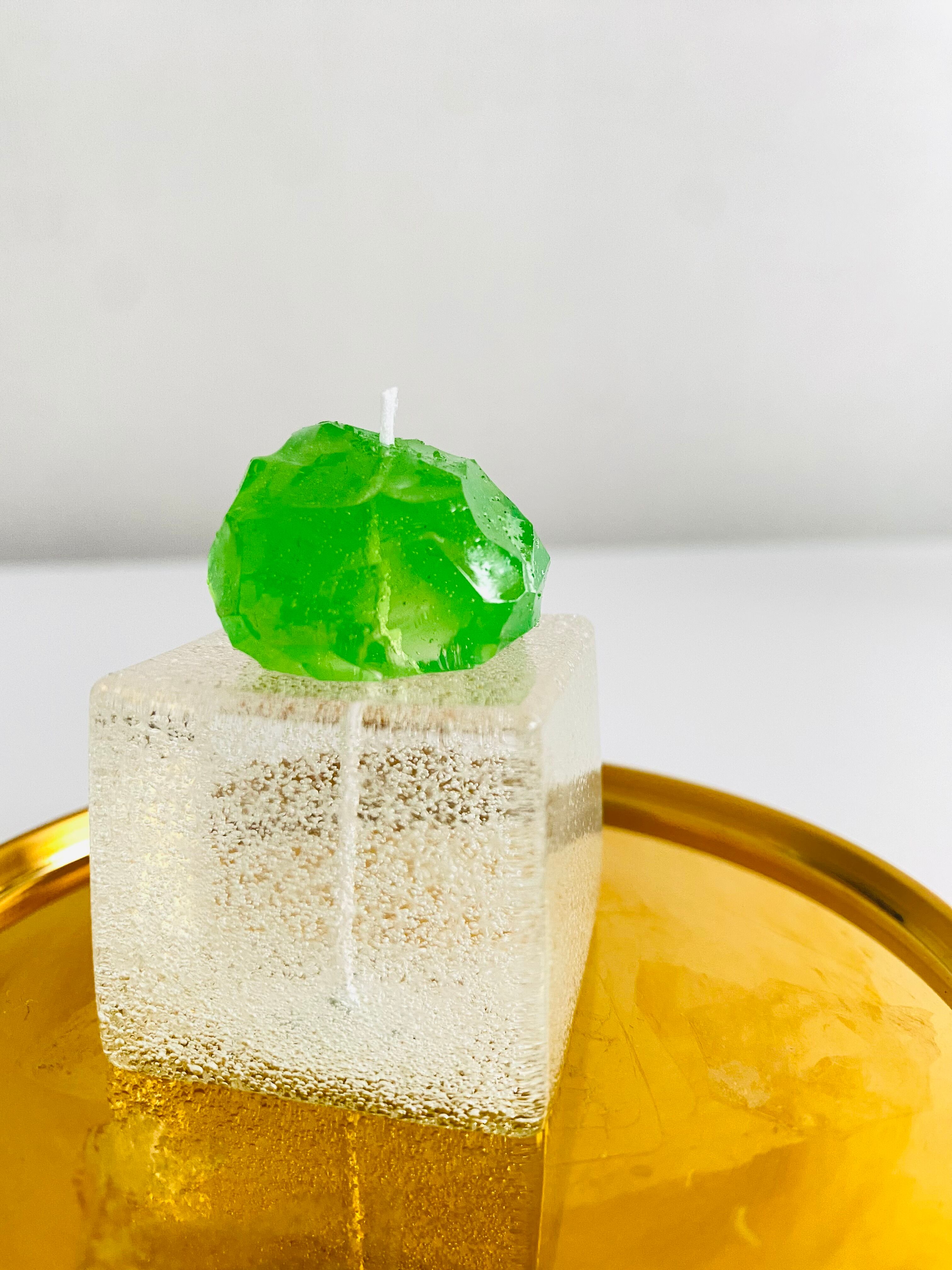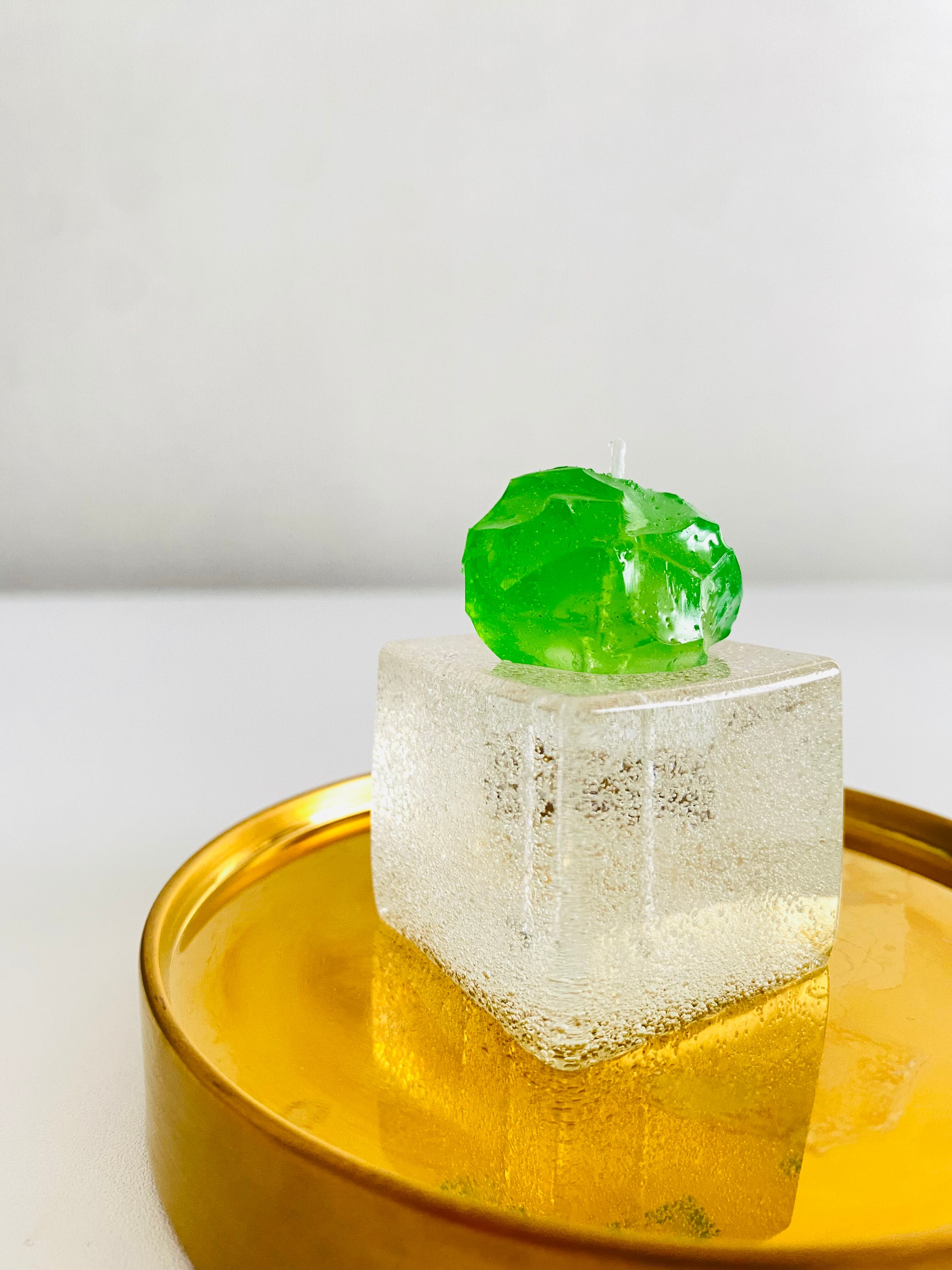 スクエアのクリアキャンドルの上にカラーストーンのようなキャンドルを乗せて