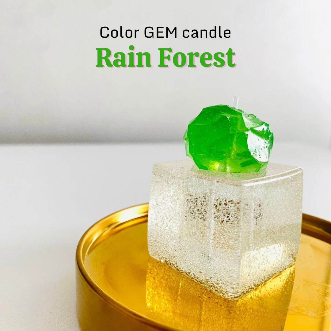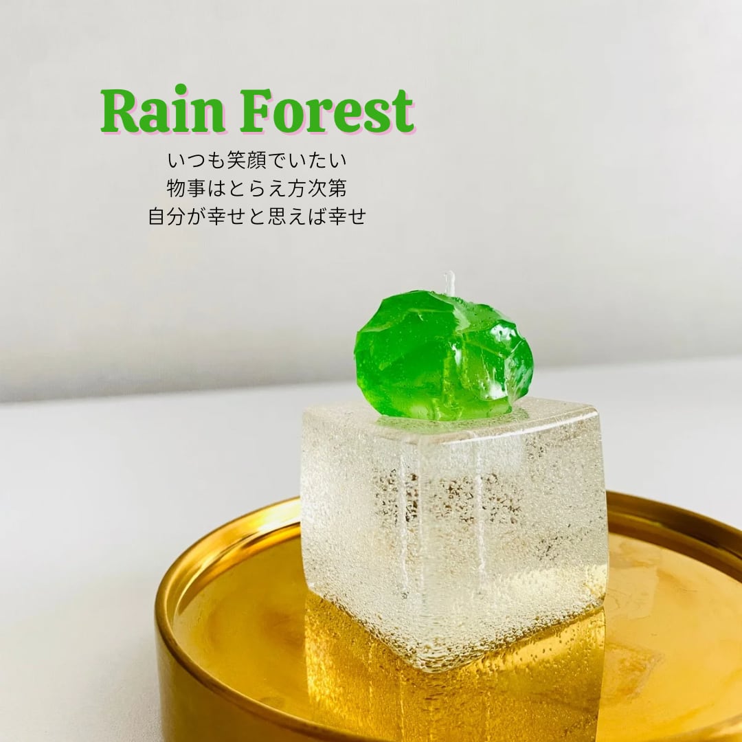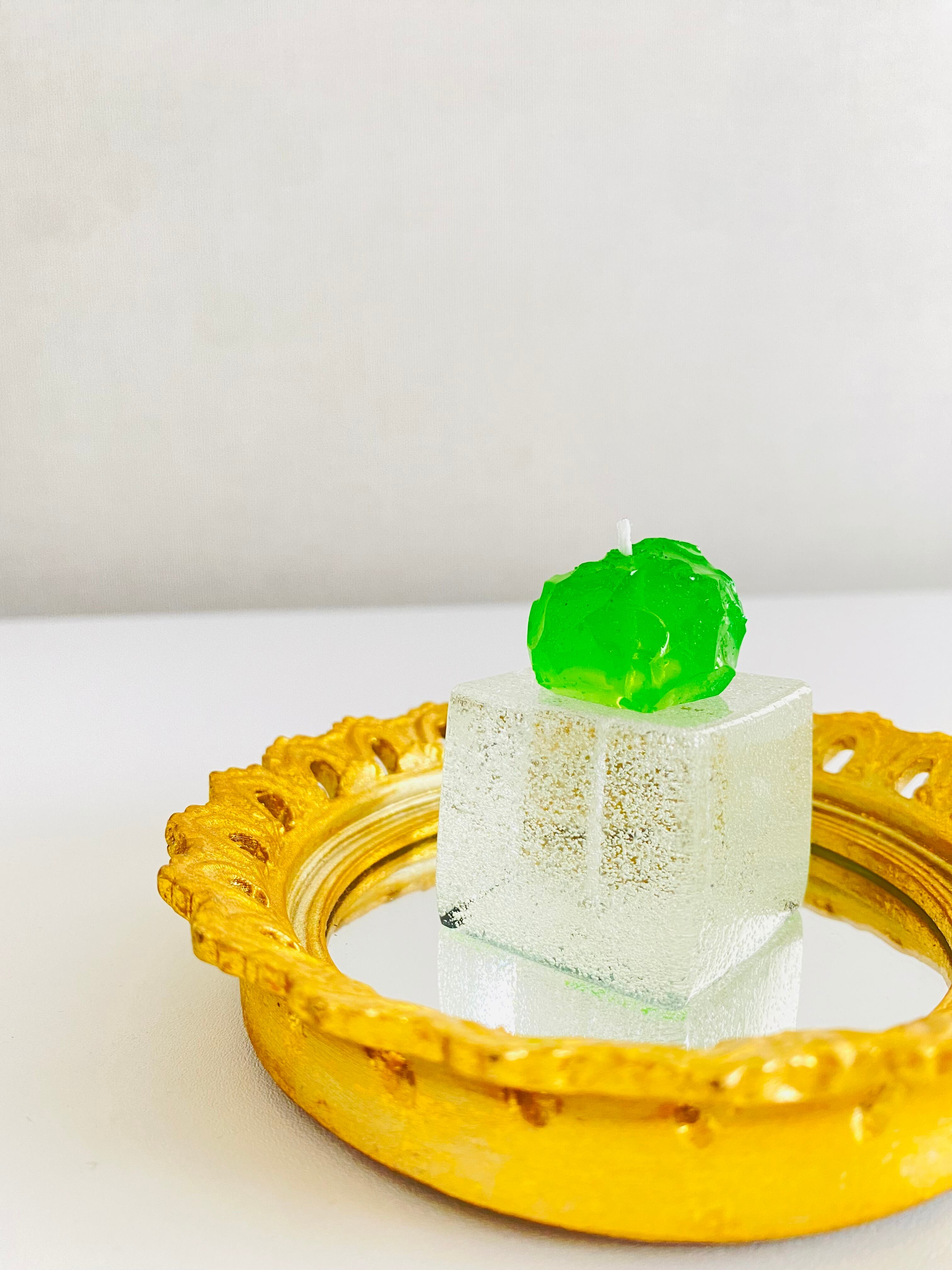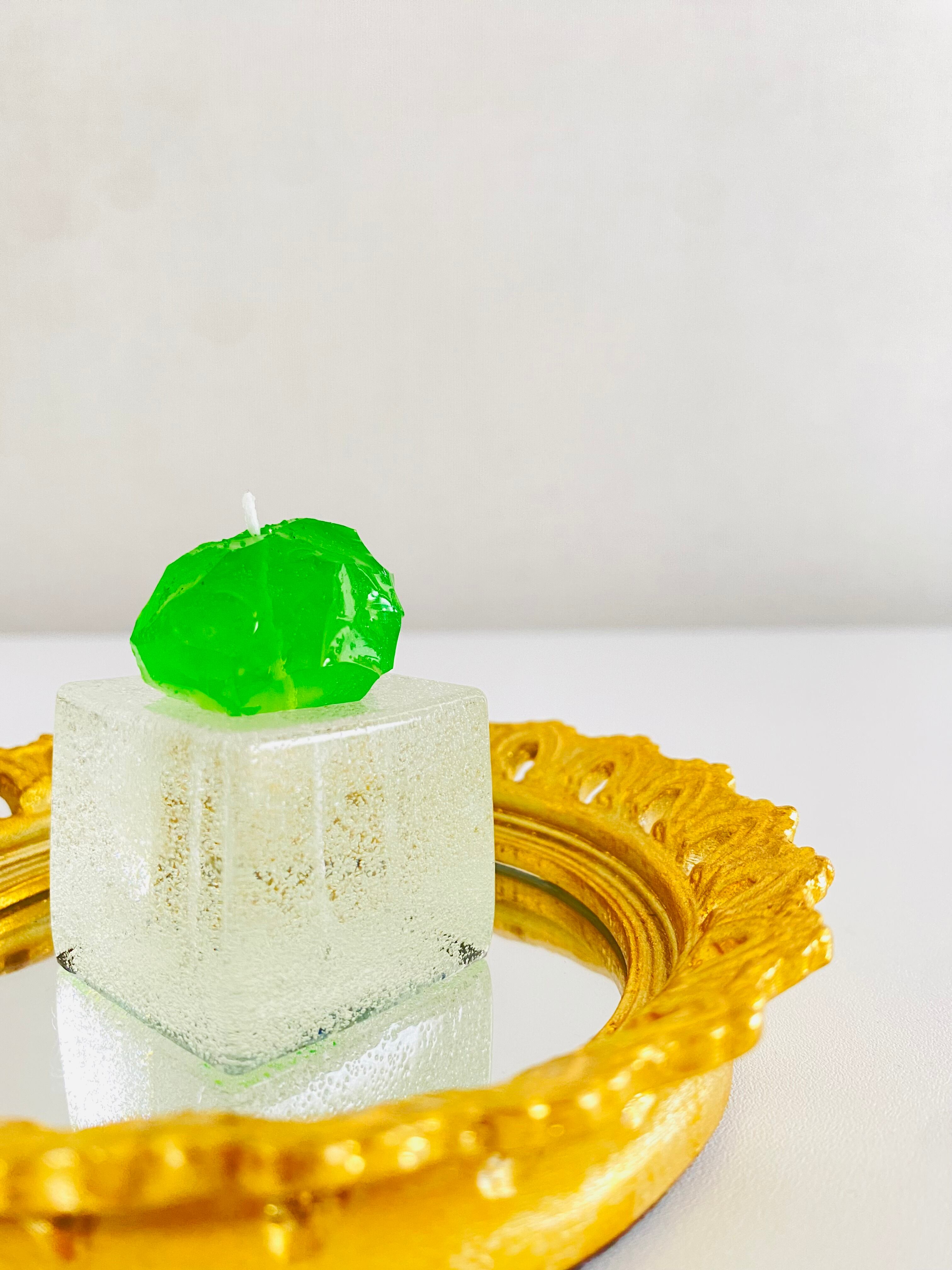 スクエアのクリアキャンドルの上にカラーストーンのようなキャンドルを乗せて