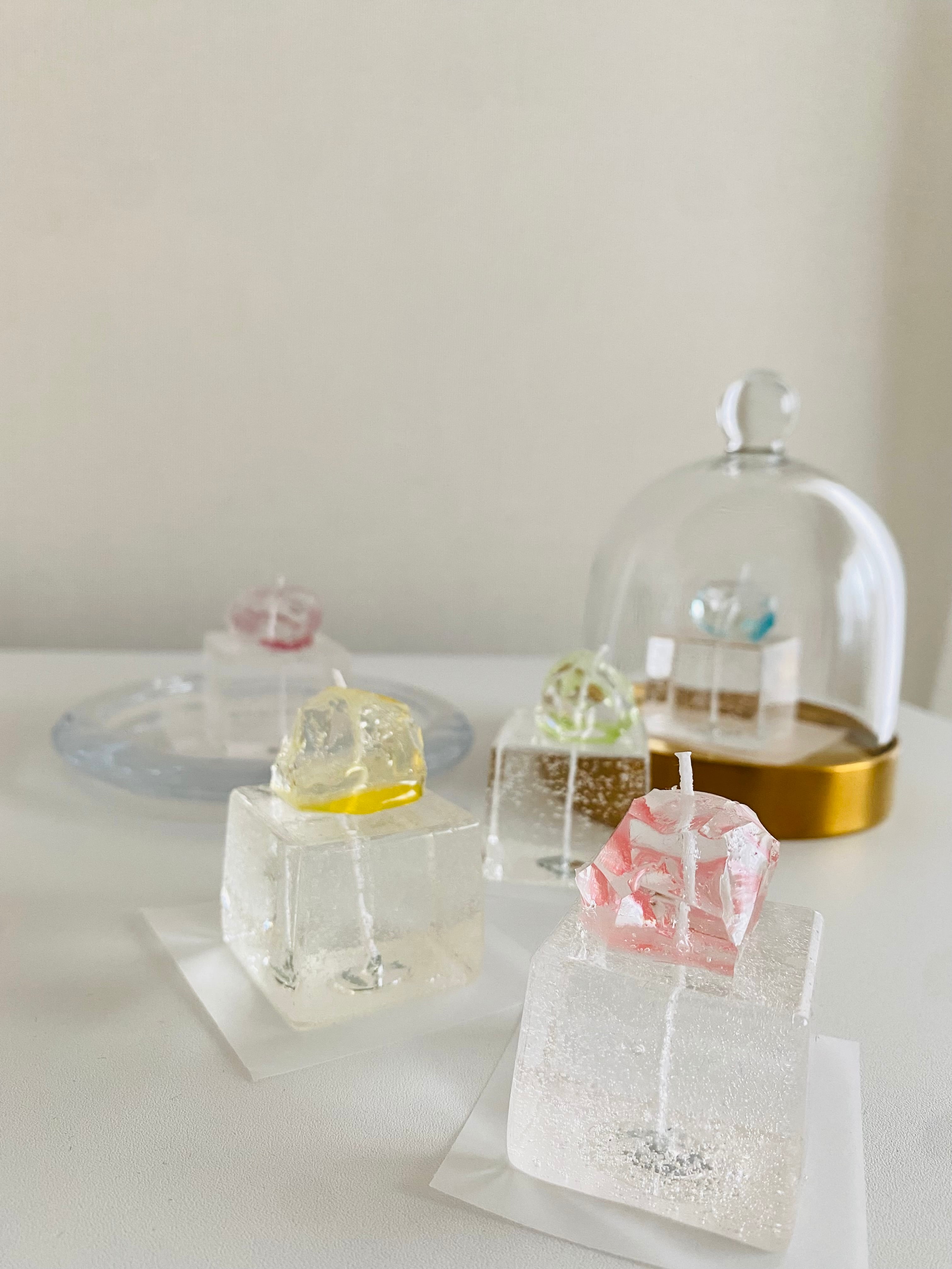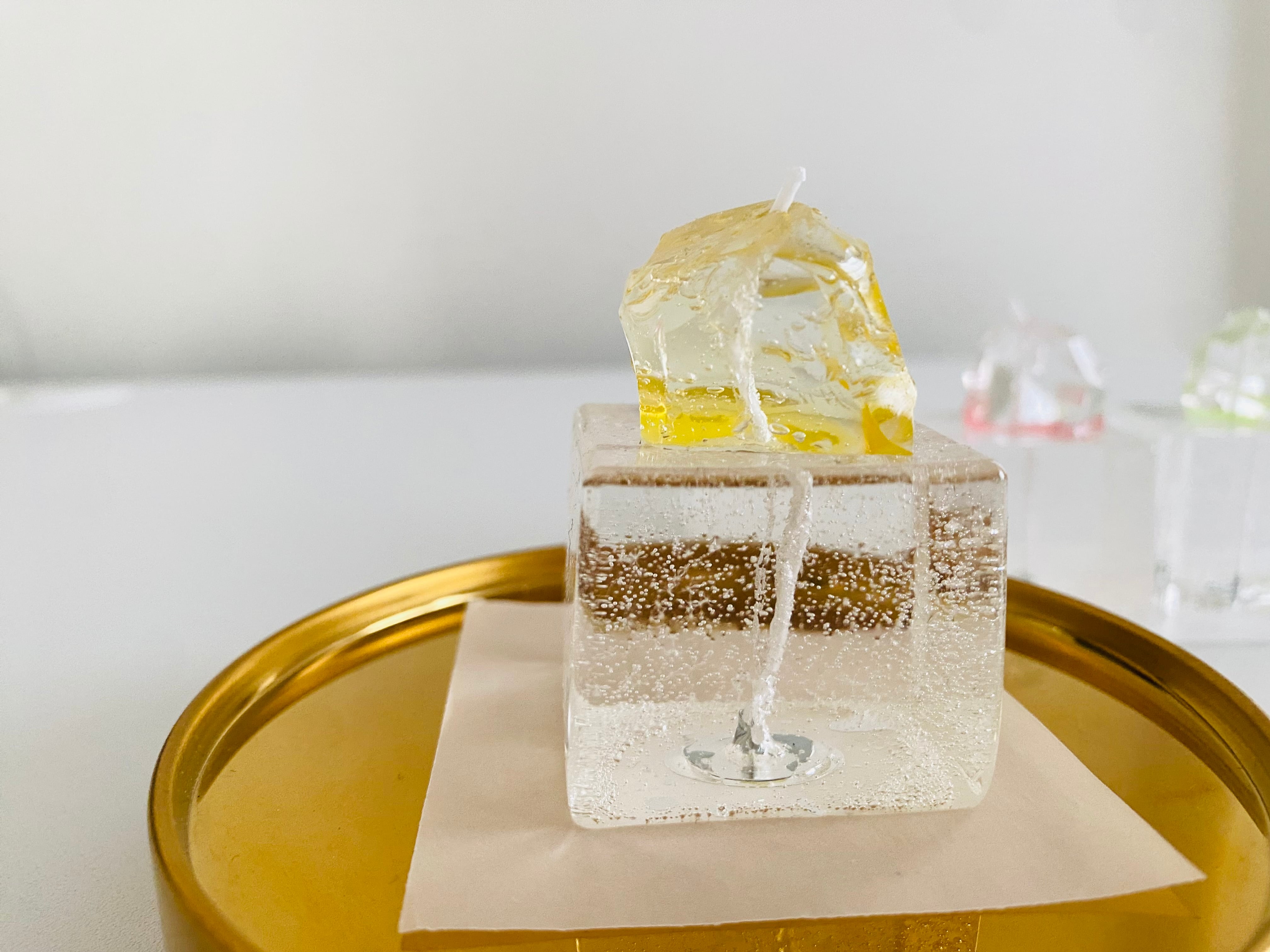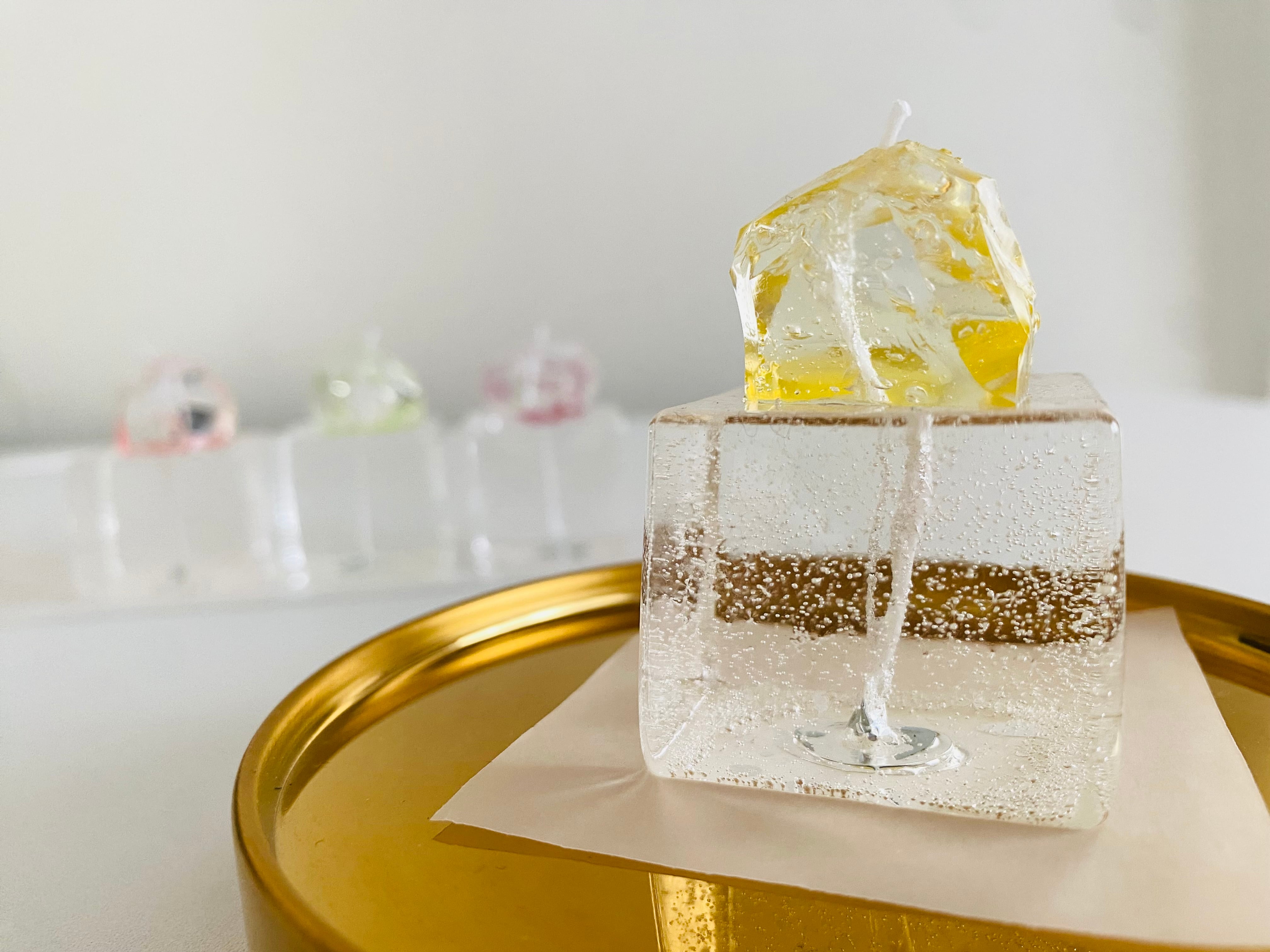 こちらのイエロークリアストーンキャンドルは、透明のスクエアの台座にクリアストーンを乗せたようなデザインが特徴です。まるで宝石を飾るかのように、見ているだけで心がときめく美しい輝きを放ちます。インテリアアイテムとしてもおすすめです、お好きな場所に飾るだけでも特別な雰囲気を演出します。