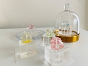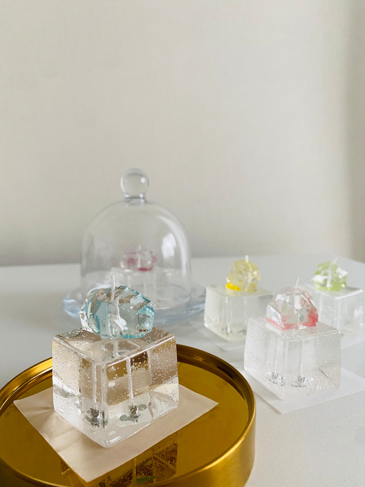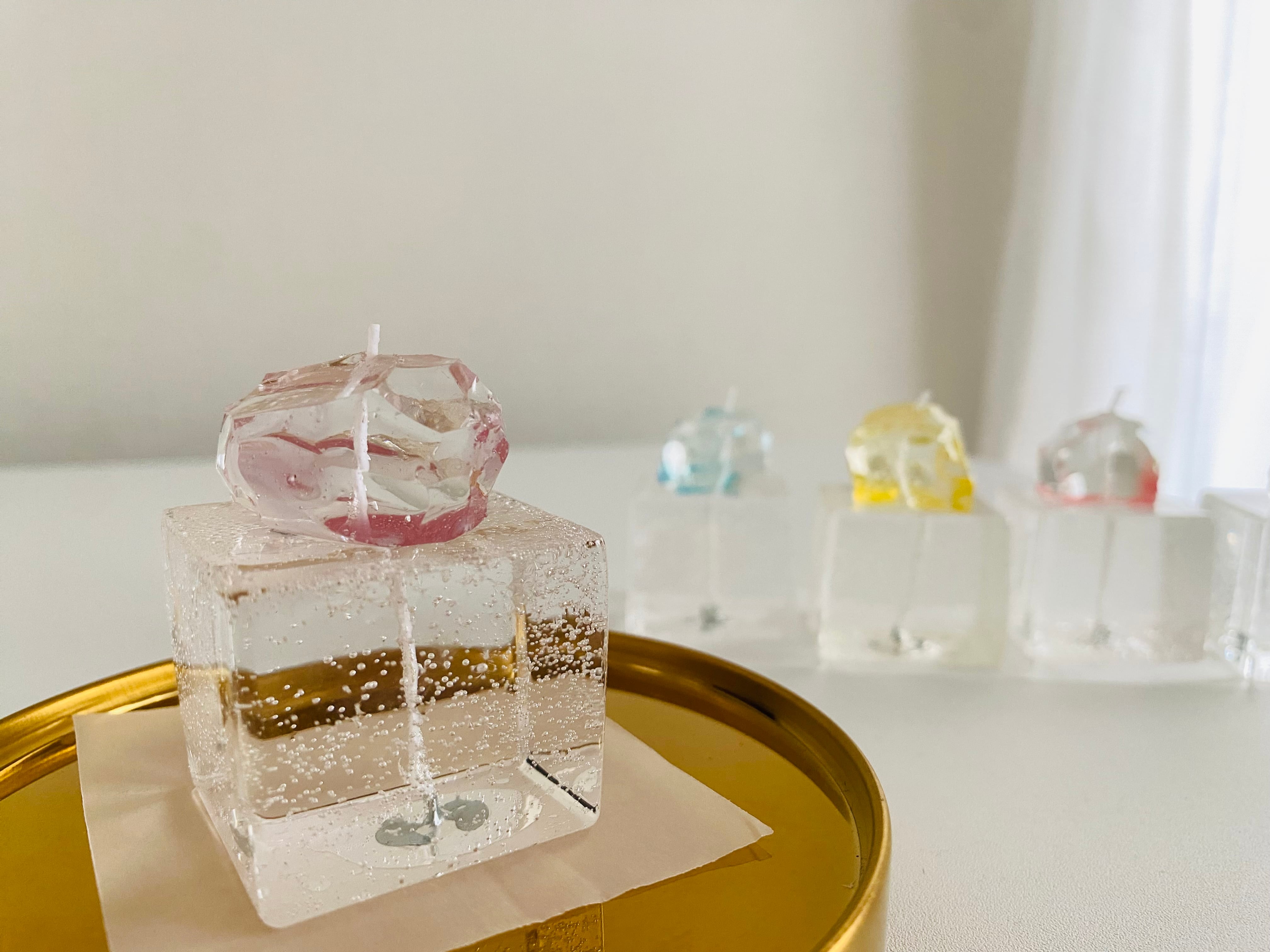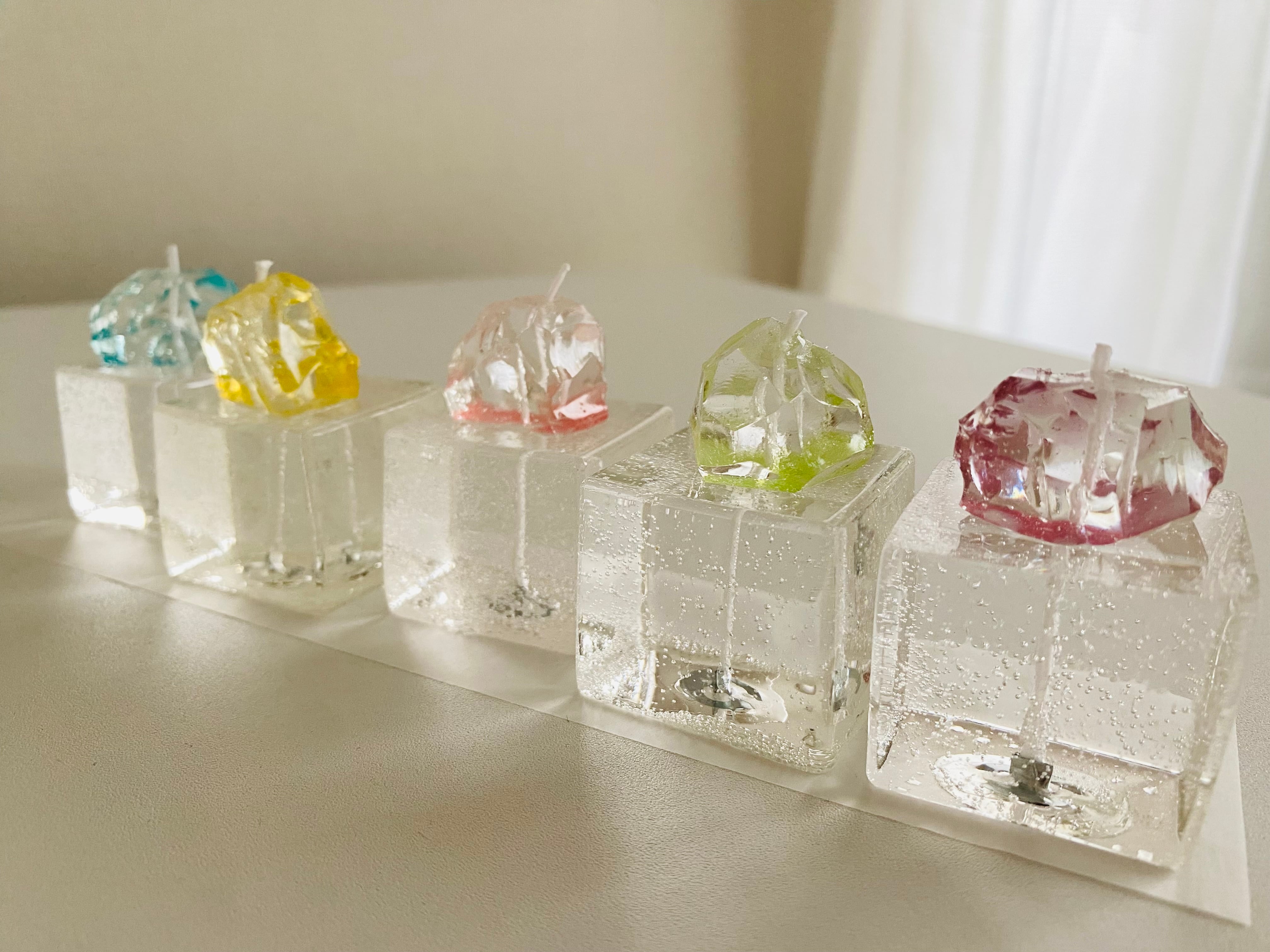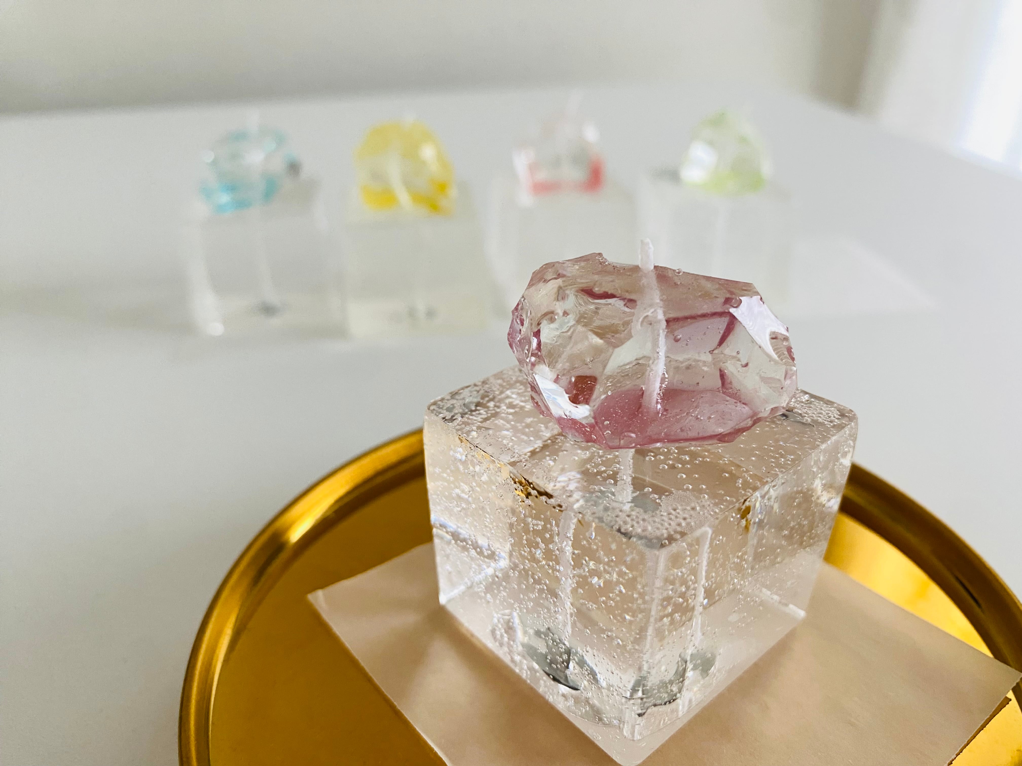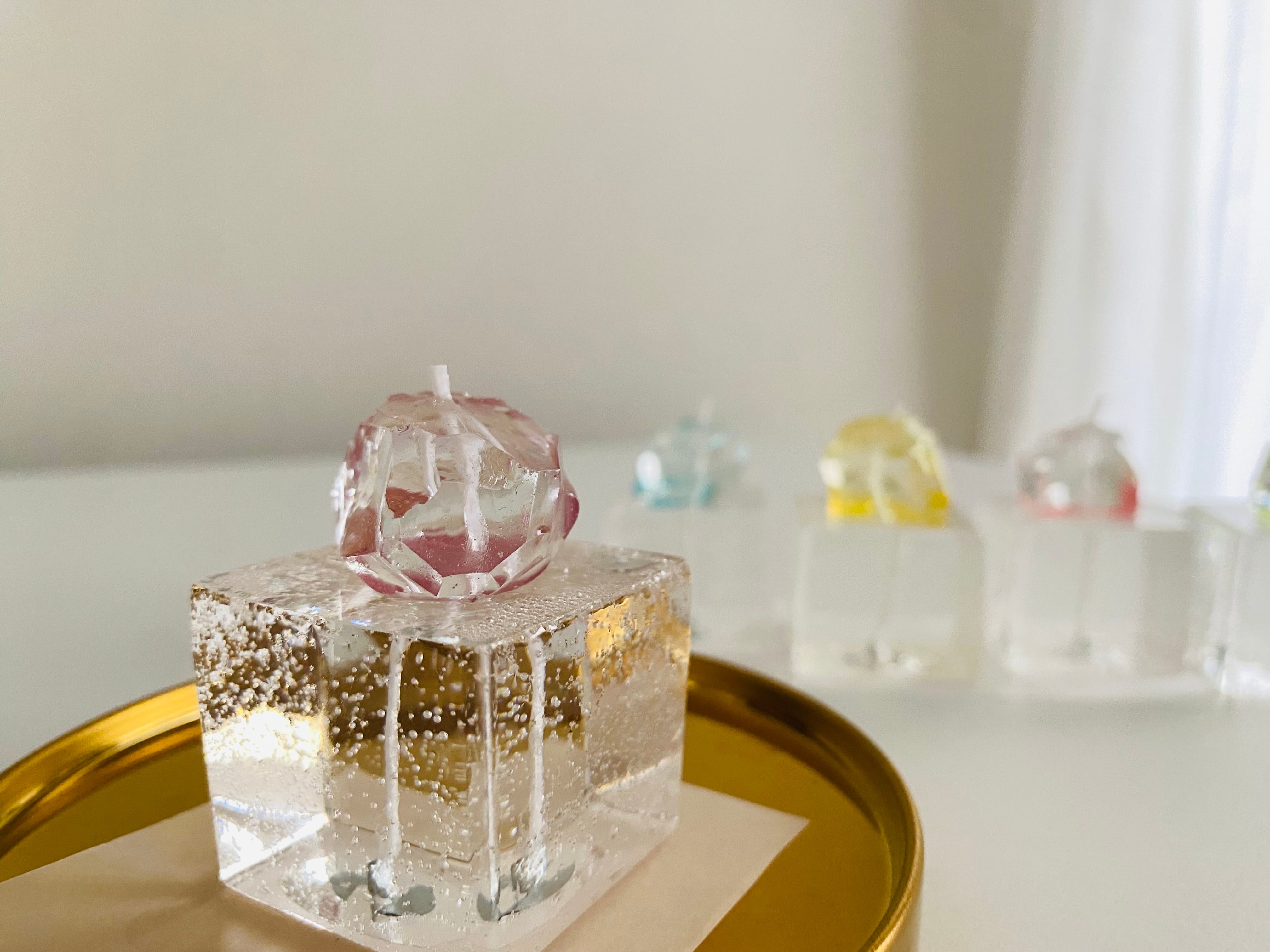 こちらのパープルクリアストーンキャンドルは、透明のスクエアの台座にクリアストーンを乗せたようなデザインが特徴です。まるで宝石を飾るかのように、見ているだけで心がときめく美しい輝きを放ちます。インテリアアイテムとしてもおすすめです、お好きな場所に飾るだけでも特別な雰囲気を演出します。